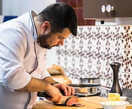 Den smörstekta kavringen med hummerpannacotta, chilistekt räka och stenbitsrom var utsökt och slank ner nästan så fort tallrikarna sattes på borden. Till huvudrätt serverades kalvrullad fylld med ostronskivling, därtill vaxbönor och potatisbakelse. Den goda konjaksgräddskyn hälldes ur små porslinstillbringare efter eget skön.