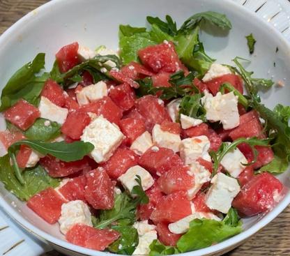 Instructions: Dice watermelon and feta evenly and mix with salad leaves.