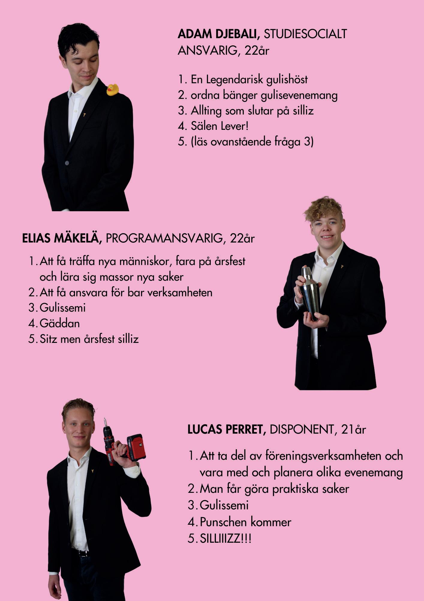 Lakkala, Elina Juslin och Lucas Miemois. Jag tänkte kort presentera mig själv, jag är 20 år gammal och hemma från Österbottens finaste kommun, Korsholm. Jag går nu mitt första år på Hanken och stormtrivs! På fritiden hittar ni mig högst troligt nere i Cella, hemma hos en kompis eller i stysserummet med en Nocco i handen när jag gör ett försök på en “academic comeback”. Jag har tyckt väldigt mycket om min post hittills eftersom den ger mig utlopp för min kreativitet och håller mig upptagen. Jag är