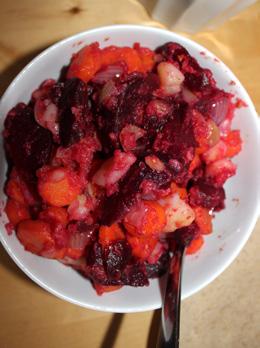 Stek morötter, potatis, lök och pressade vitlöksklyftor i en stekpanna på medelhög värme. Ha i salt och låt stå i fem minuter. Ha i rödbetorna och stek sedan på till allt har blivit mjukt. Rör om med jämna mellanrum.