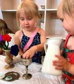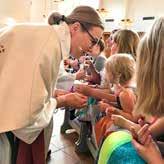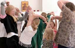 Fanny ja Vera leikkivät lasten kirkossa. Seurakuntalaisten kutomat Äiti Teresan peitot siunattiin ja peittivät kaiteen, kun pastori Johanna Suban jakoi ehtoollista. Sollidenin leirillä pidettiin taukojumppaa. svenskakyrkan.se/ orebro/sverigefinskt