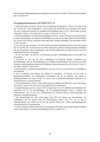 Övergångsbestämmelser till SvKB 2012:14 1. Detta beslut träder i kraft den 1 januari 2014 med undantag för ändringarna i 38 kap., som träder i kraft den 1 januari 2013. Äldre bestämmelser i 38 kap. gäller dock fortfarande när nya ledamöter och ersättare ska utses i direktvalda kyrkoråd och samfällda kyrkofullmäktige under år 2013. Hänvisningen avseende valnämnder i 38 kap. 5 § ska under 2013 avse 4 kap. 14–20 §§ och 22–23 §§. 2. Pastoratssamfälligheter och flerpastoratssamfälligheter blir den 1 januari 2014 pastorat. Detsamma gäller de pastoratssamfälligheter och flerpastoratssamfälligheter om vilka det har fattats beslut med ikraftträdande den 1 januari 2014. Om det i pastoratens namn ingår orden ”kyrkliga samfällighet” ska detta istället ersättas av ordet ”pastorat”. 3. Trots vad som sägs i punkterna 1 och 2 får Göteborgs kyrkliga samfällighet finnas kvar fram till och med den 31 december 2017. Kyrkostyrelsen får utfärda bestämmelser gällande Göteborgs kyrkliga samfällighet och dess församlingar under övergångstiden, samt särskilda bestämmelser avseende kyrkovalet 2013 till samfälligheten och dess församlingar. För att vara valbar i ett direktval i en församling som ingår i samfälligheten krävs att man tillhör den församlingen. 4. Kyrkovalet år 2013 ska för andra samfälligheter än Göteborgs kyrkliga samfällighet avse kyrkofullmäktige i pastorat. Kyrkofullmäktige och samfällda kyrkofullmäktige ska vid beslut om antalet ledamöter i det kommande pastoratets kyrkofullmäktige tillämpa bestämmelserna i den lydelse av 3 kap. 5 § som träder i kraft den 1 januari 2014. 5. Kyrkonämnden i en flerpastoratssamfällighet ska utse den som ska vara kyrkoherde när samfälligheten blir ett pastorat. 6. När en befattning som domprost ska tillsättas för anställning i ett pastorat som har varit en flerpastoratssamfällighet ska samfällighetens kyrkonämnd utse de tre ledamöter och ersättare i tillsättningsnämnden som enligt 34 kap. 12 § annars utses av domkyrkoförsamlingens kyrkoråd, av en kyrkonämnd eller av en pastoratsnämnd. 7. Trots bestämmelserna i 36 kap. 5 § får kontrakt enligt den indelning som gäller den 1 januari 2014 finnas kvar till den 1 januari 2016, även om de då inte uppfyller dessa bestämmelser. 8. Gruppbeteckningar som den 1 januari 2013 är registrerade för val till samfällda kyrkofullmäktige blir registrerade för val till kyrkofullmäktige. Då ska gruppbeteckningarna ändras i enlighet med bestämmelserna i nya 38 kap. 25 §. Stiftsstyrelserna ska informera berörda nomineringsgrupper om ändringen av gruppbeteckningarna. 9. När församlingsråd ska väljas första gången efter 2013 års kyrkoval ska kyrkonämnden i de samfälligheter som blir pastorat kalla till församlingsmöte enligt 4 kap. 23 §. Om det sker en indelningsändring som innebär att ett helt nytt pastorat bildas, ska i stället indelningsdelegerades arbetsutskott kalla till församlingsmöte. 10. Äldre bestämmelser gäller fortfarande för överklaganden och begäran om beslutsprövningar beträffande beslut som har fattats av en flerpastoratssamfällighet före den 1 januari 2014.