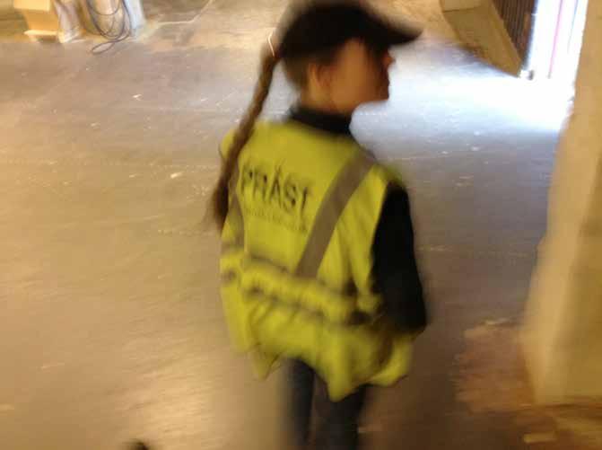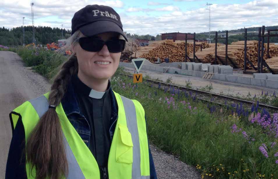 Jag är här tillsammans med prästen Maria Scharffenberg från Sköns församling. Hon har prästkragen på sig, “världens snabbaste identitetskort”, som hon säger. Hon har också en gul reflexväst med “präst” tryckt på ryggen samt en specialdesignad keps med samma budskap. Med eget passerkort visar hon mig runt bland mängder av timmer och truckar, verkstäder och kontor. Senare på dagen även hamnen där brädor och färdigt papper transporteras ut i världen. Överallt har hon access och överallt hejar personalen glatt när hon kommer, “ ministering by waving” som hon själv säger. Hos många stannar hon, småpratar lite, svarar på frågor: “hur har helgen varit?”, “måste man vara medlem i kyrkan för att få gifta sig?”, “det nya datasystemet krånglar...”