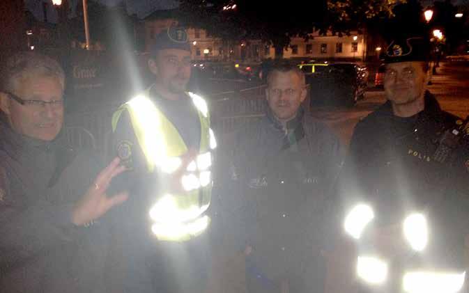 Jag samtalar med närpolischefen Ola Severinsson som patrullerar under kvällen. Han har precis hjälpt en flicka att få tillbaks sitt borttappade kreditkort. Han berättar att han försöker få ungdomarna att förstå att vi alla spelar i samma lag, att även han som polis står på ungdomarnas sida. Han har sedan länge samverkat med Svenska kyrkan: ”De gör en jättefin insats, deras närvaro har en mycket lugnande effekt”.