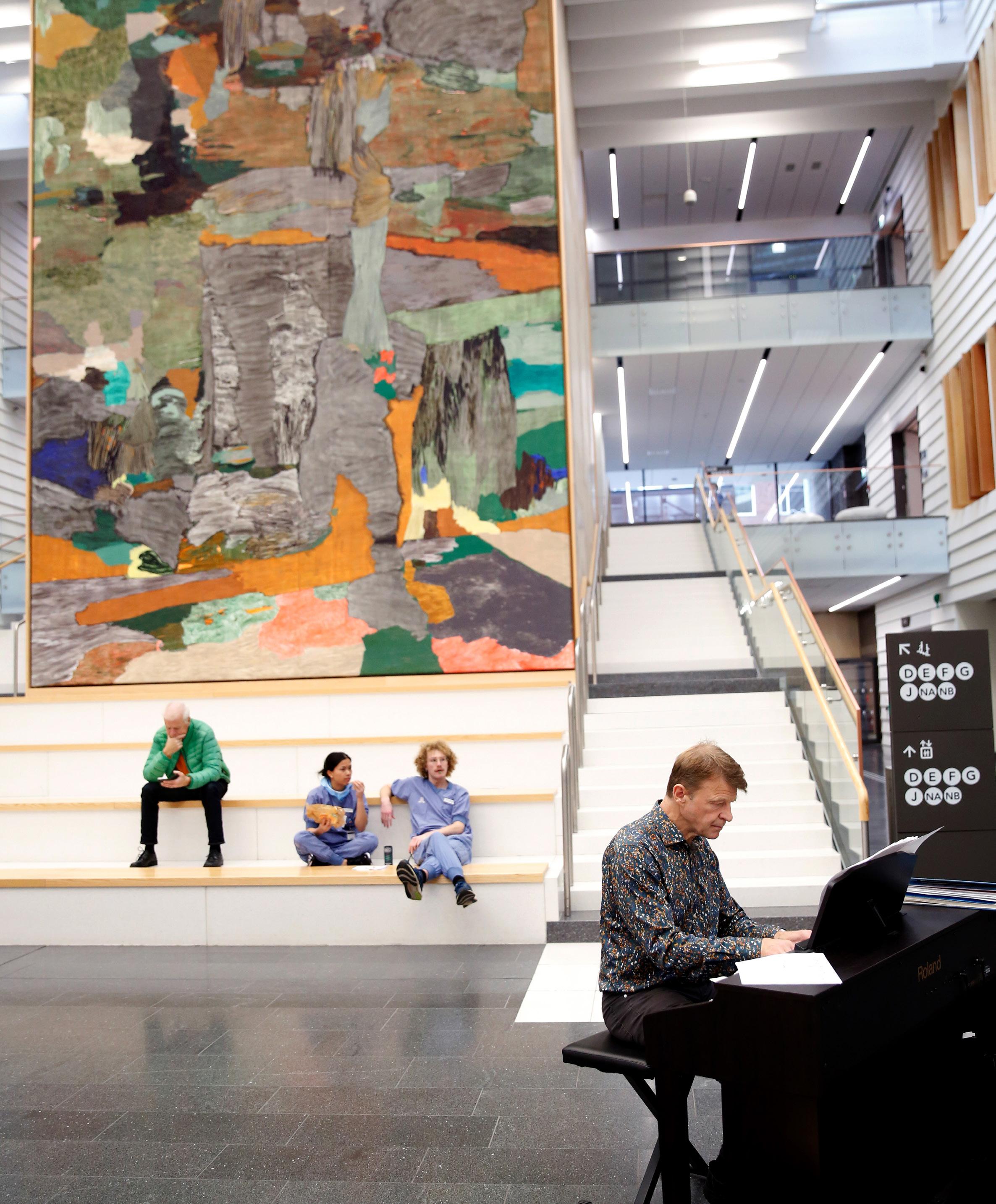 Karolinska universitetssjukhuset i Solna | onsdag 2 november kl. 12.08 lunchmusik för patienter och personal. Varannan onsdag flyttas pianot ut i foajén. Lars Artborg, organist i Solna församling sätter sig och bläddrar i notbladen och låter klassiska toner sprida ett lugn mitt i lunchmyllret. Personal skyndar nedför trapporna för att göra lunchinköp, patienter väntar eller passerar f örbi på väg mot trapporna, ett par Röda Korset-volontärer med visir stannar till efter avslutat ledsagningsuppdrag. Från caféet mittemot kommer en lunchgäst som just avslutat sin måltid och tackar för musiken.