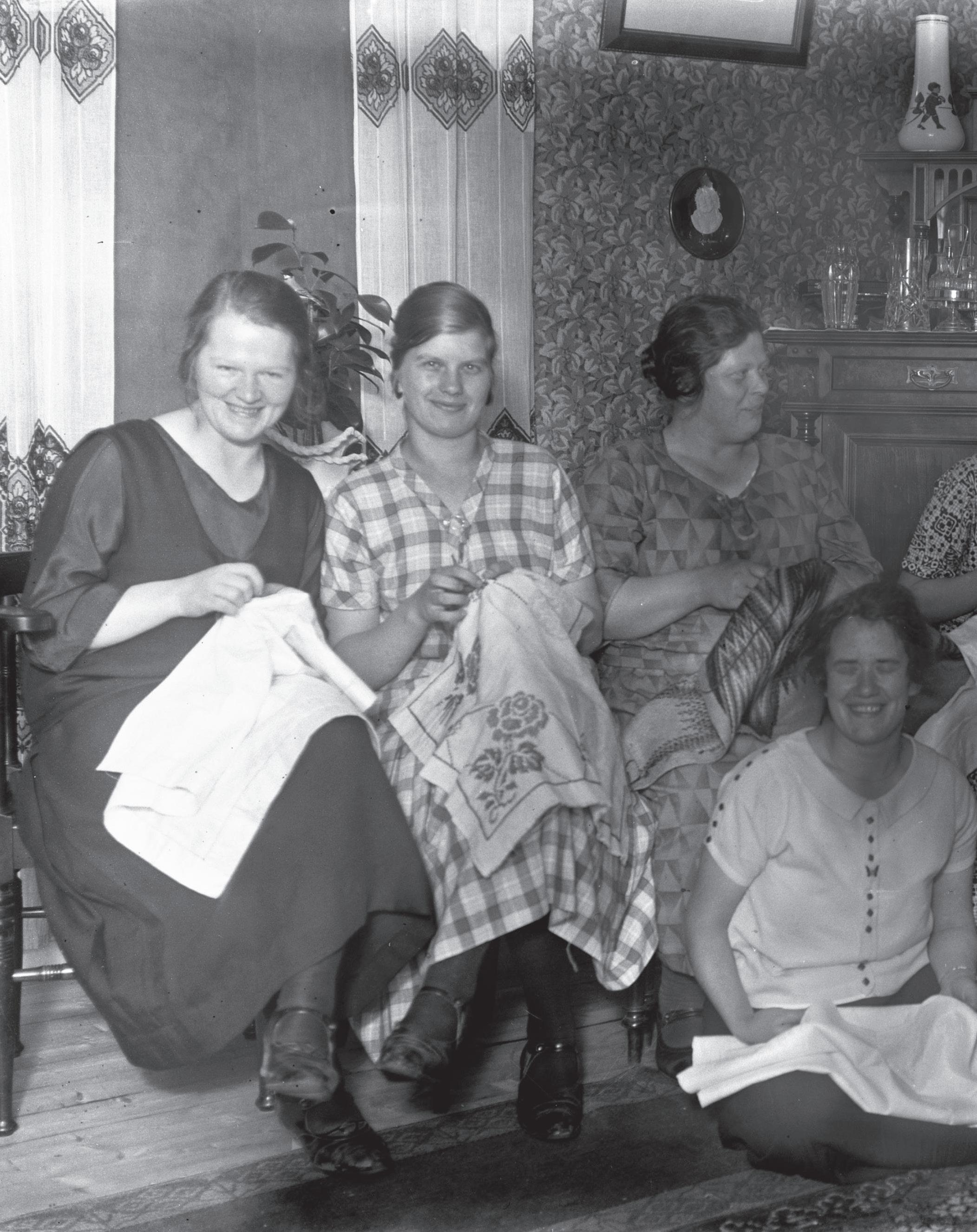 En av alla syföreningar i Sverige, hemma hos familjen Karlsson i Småland 1920-tal. Emilie Petersen skrev om syföreningarna: "Önskligt vore om fler sådana kretsar bildade sig. Jag tror att samfundet skulle bliva styrkt genom sådana föreningar."