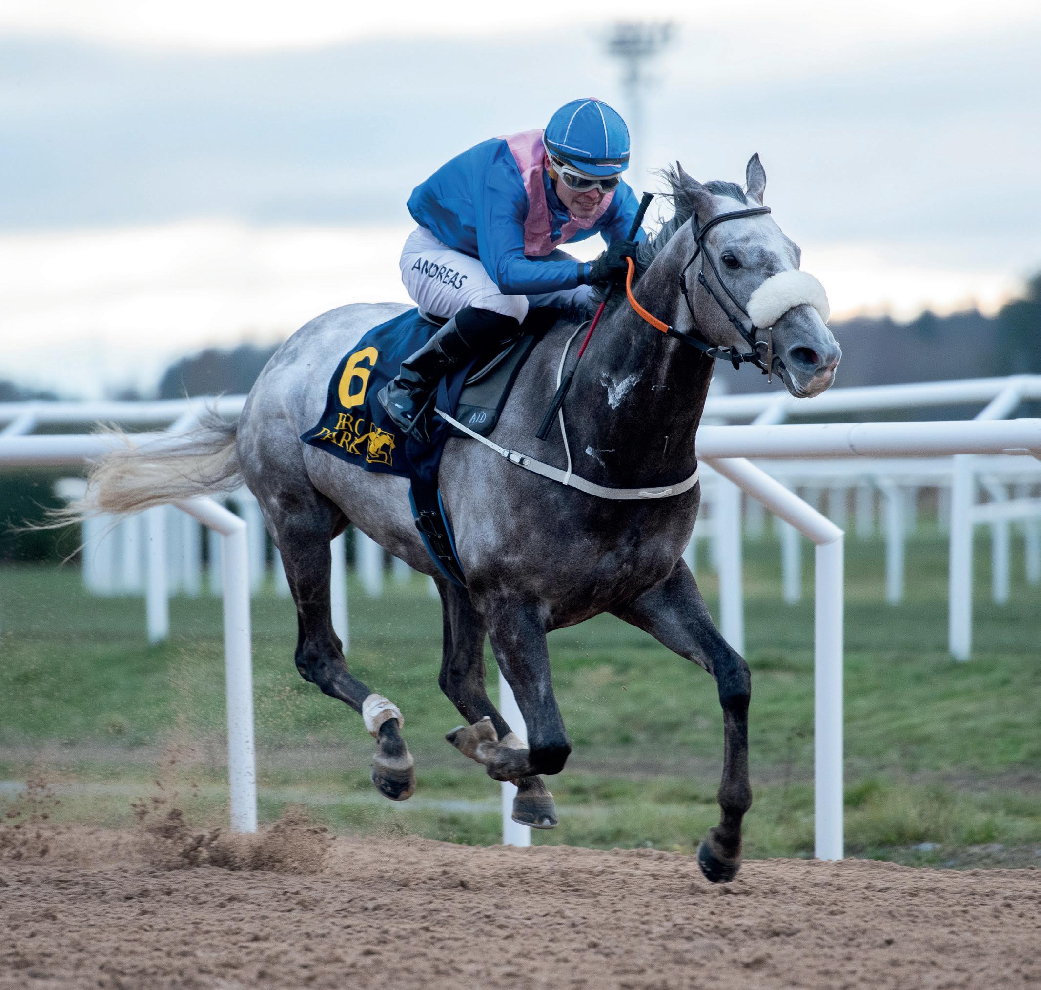 Bilden på framsidan: Stall Strandvägen-Easys BEACH ROAD ONE avslutade fjolåret med en seger, då under Andreas Tapia Dalbark, och inleder 2023 som högst rankad och toppviktad i en guldhandicap, nu med P-A Gråberg. Caroline Malmborg tränar den talangfulle skimmeln, som åter får möta bland andra Ocean Side. Foto Elina Björklund/Svensk Galopp.