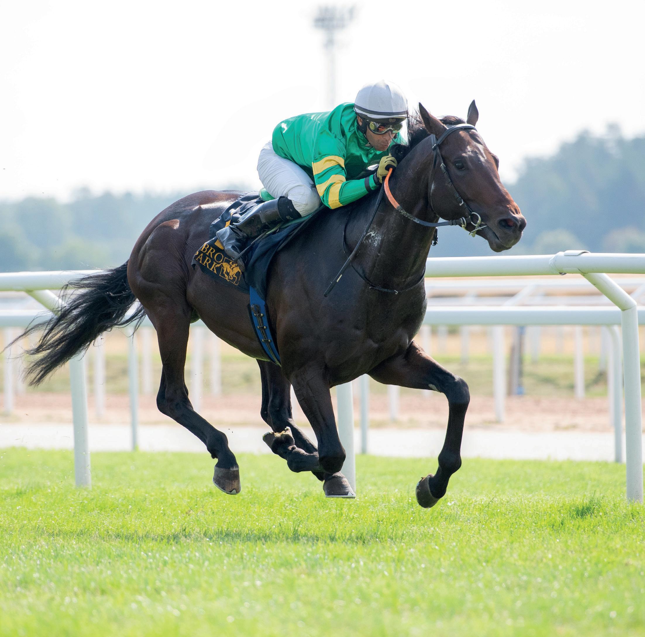 Bilden på framsidan: Maria Sandh-tränade SAIGON är högst rankad i kvällens Guldhandicap, som är lopp 3, och vann i sin senaste start tillsammans med Ulrika Holmquist, som sitter upp igen. Swipe-sonen ägs av tränaren tillsammans med Stall LATA och Tomas Lostrand och är uppfödd av Rävdansens Stuteri AB. Foto: Elina Björklund, Svensk Galopp.