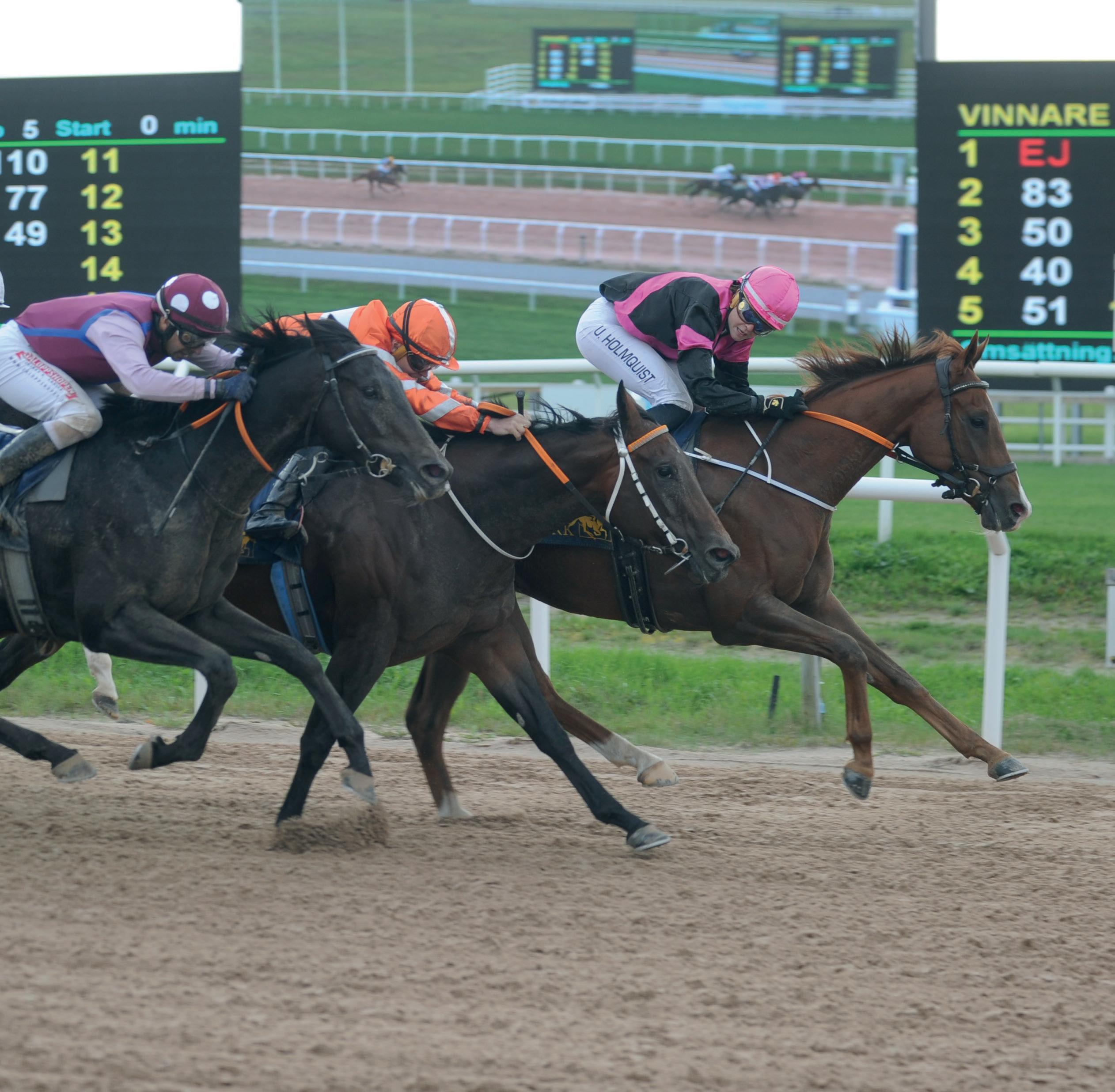 Bilden på framsidan: De många delägarna i Min Galopphäst Sverige AB fick gå in i vinnarcirkeln två gånger i onsdags, först med Annika Sjökvist-tränade DAYBREAKER (bilden) och sedan med FORWARD FUN som tränas av Catharina Vång. Täta slutstrider och mycket spänning blev det i båda loppen och segerryttarna Ulrika