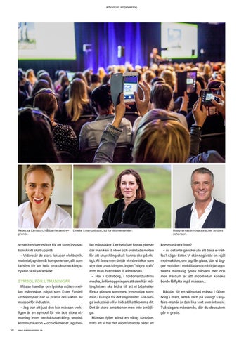 scher behöver mötas för att sann innovationskraft skall uppstå. – Vidare är de stora fokusen elektronik, material, system & komponenter, allt som behövs för att hela produktutvecklingscykeln skall vara täckt! SYMBOL FÖR UTMANINGAR Mässa handlar om fysiska möten mellan människor, något som Ester Fardell understryker när vi pratar om vikten av mässor för industrin. – Jag tror att just den här mässan verkligen är en symbol för vår tids stora utmaning inom produktutveckling, teknisk kommunikation – och då menar jag mel58