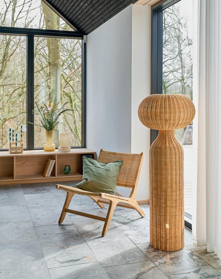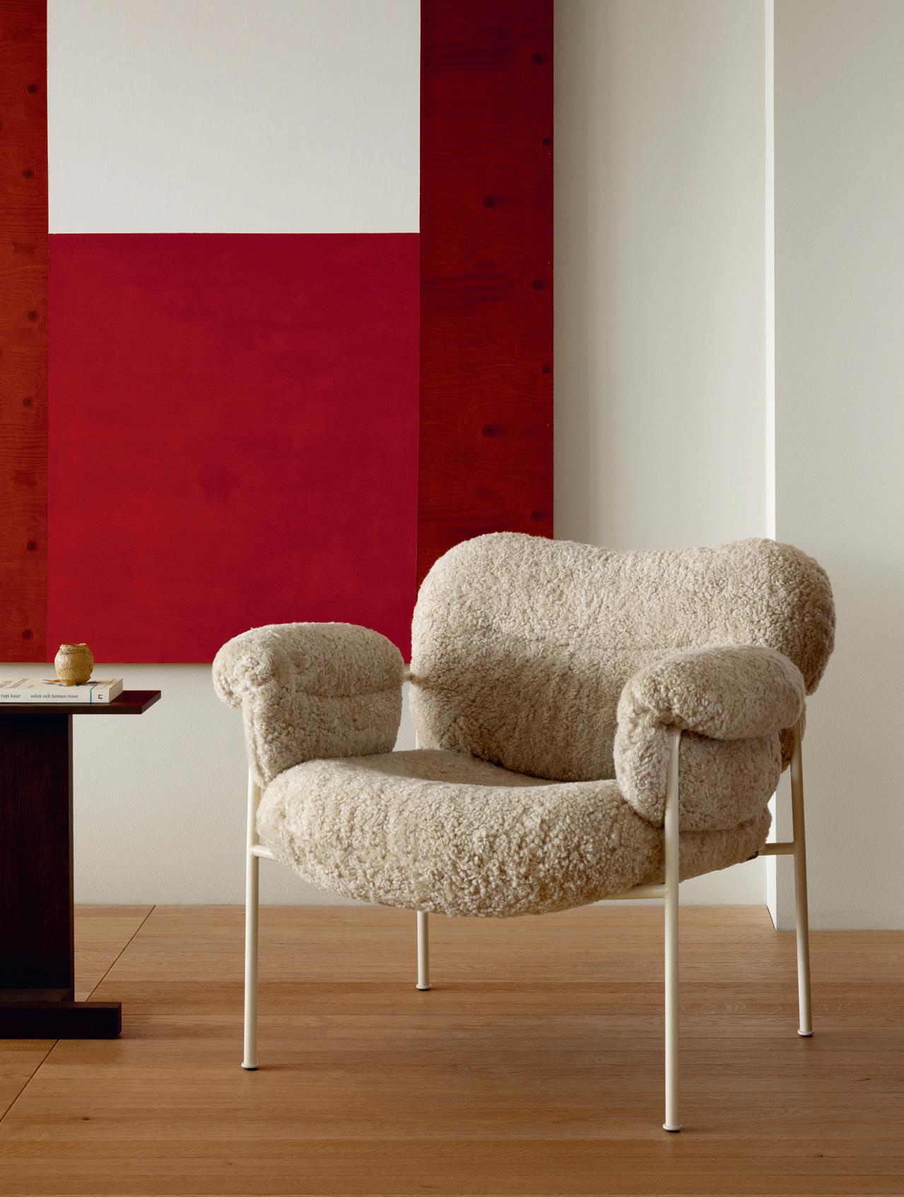 Fåtölj Bruno från Källemo. I vardags rummet skymtar soffa Sjövik från 1898 och soffbordet Androgyne från Menu.