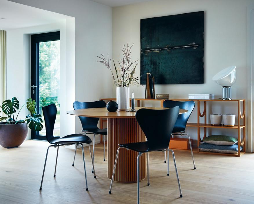 Matbord Palais från Asplund. Stolar Sjuan 3107 från Fritz Hansen. Hylla Arch från Fogia. Bordslampa Taccia från Flos. Tavlan är gjord av Marcus Törnqvist, #steel_des.