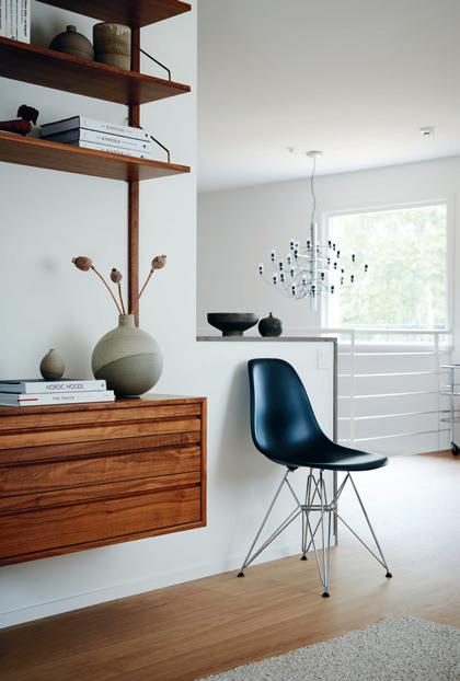 Hyllsystem Royal från DK3, stol Eames plastic side chair från Vitra. Över trappan hänger en 2097 Sarfatti-ljuskrona från Flos.