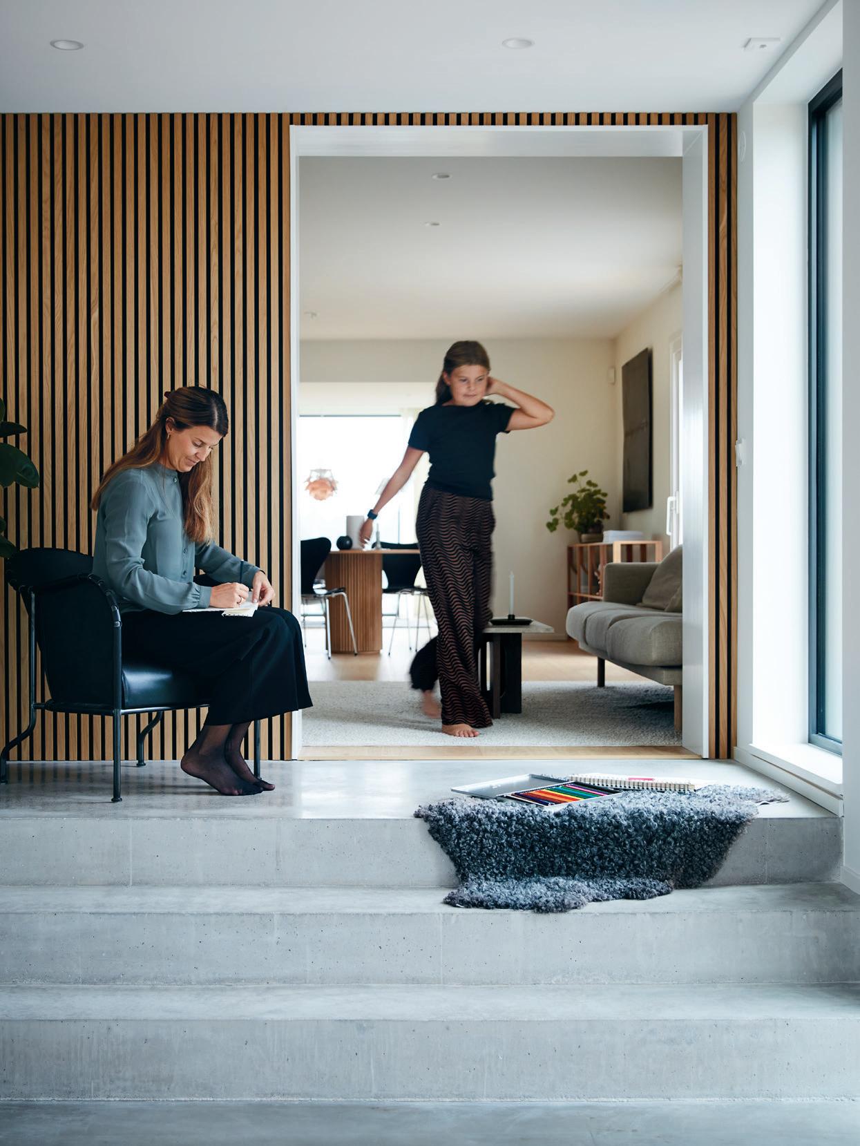 – Vårt hus kan lätt uppfattas perfektionistiskt (skratt) men vi vill ha det så. Vi har valt att låta var sak ha sin plats och en klassisk och tidlös inredning med spän nande rum, nivåskillnader och ljusinsläpp. Oavsett vår stil välkomnar vi att barnen får ta plats, spåren av dem gör vårt hem levande.