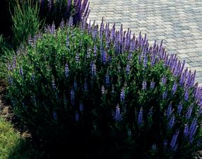 Salvia ’Violet Profusion’ Violetta blommor på mörka stjälkar. Upprättväxande. Läge: sol. Blomning: juni-sept. H: 40 cm.