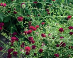 Knautia macedonica Mörkröda blommor på långa stjälkar. Blomning: juli-sept. Läge: sol. Härdighet: B*.