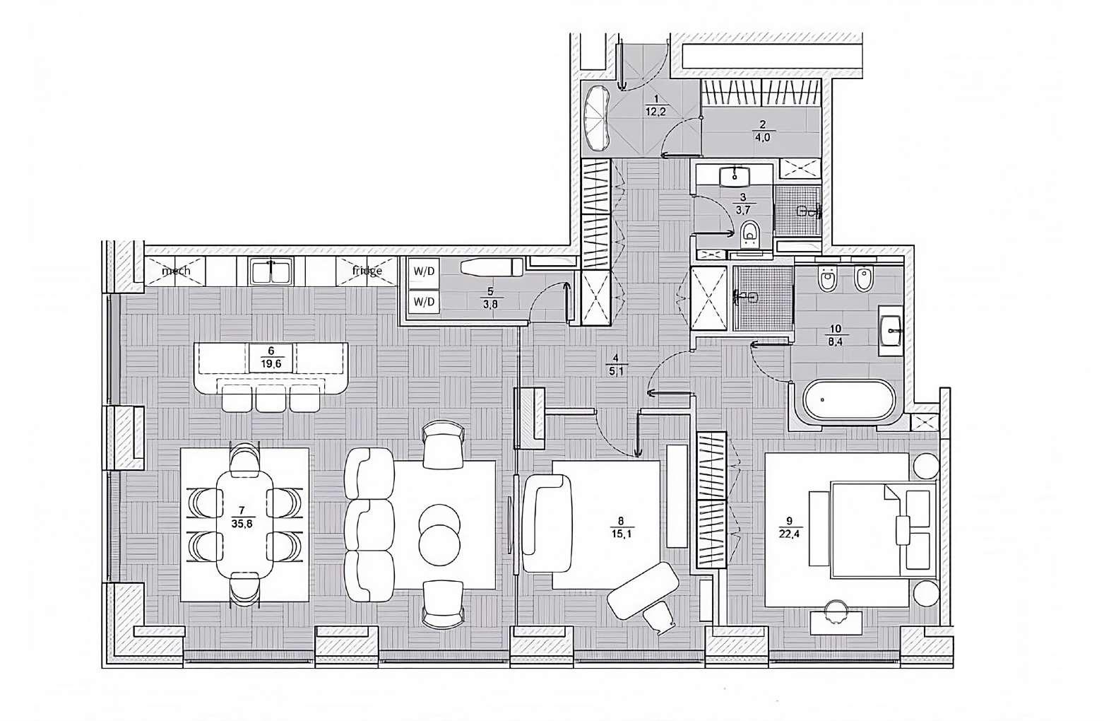 Materials Palette: The materials and fabrics used are carefully chosen to enrich the textural experience of the apartment.