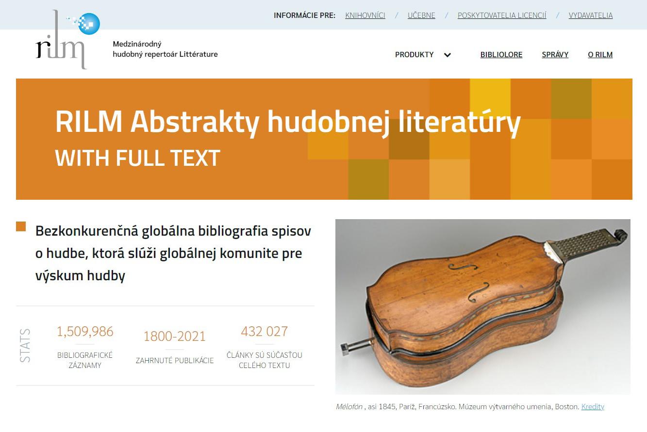 Bádatelia a návštevníci z radov odbornej verejnosti môžu v Hudobnom átriu vy užiť aj prístup k muzikologic kej databáze RILM Abstracts of Music Literature with Full Text. Je to obsiahla muziko logická databáza odborných hudobných časopisov, kto rá poskytuje jednoduchý prístup k detailným infor máciám týkajúcich sa hud by. Databáza RILM zachytá va obdobie od roku 1967 až po súčasnosť, pričom doku mentácia zborníkov siaha až do roku 1835. Zahŕňa všetky typy dokumentov o tradičnej hudbe, populár nej hudbe, jazze, klasickej hudbe a súvisiacich témach publikovaných kdekoľvek na svete a v akomkoľvek jazyku. RILM obsahuje plnotextové vedecké články, hudobné recenzie, konferenčné prí spevky, úvodníky, korešpon denciu, spravodajské správy, dizertácie, technické nákre sy nástrojov a ďalšie.