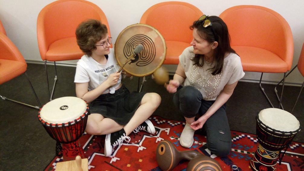 Návštevníčky Hudobného átria si s nadšením vyskúšali hru na šamanský bubon a maracas