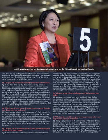 AMA meeting during her first campaign for a seat on the AMA Council on Medical Service and thus did my undergraduate education, medical school education, and residency training in Michigan. I returned to California after finishing my training, and I now live in the same community in which I grew up. Q: Can you tell us how you manage your work life balance? LJ: It is definitely a day-by-day, even hour-by-hour, adjustment. I am fortunate to have a very supportive family including having my parents living nearby. My husband and I joke that our children did ok, DESPITE us. For better or worse, we were too busy to helicopter parent our kids and they had to learn independence and resourcefulness early in life. I have many stories that we laugh about now. Balance is a moving target, but I would say that it starts with self-assessment and being aware of what is really meaningful--what are your real priorities. I don’t sleep much, but even so, more recently, I find that I have had to set limits and recognize that you can’t do all things all of the time. Q: What’s one lesson you’ve learned in your career that you can share with our audience? LJ: Never underestimate the importance of relationships. It is the personal connections that not only make the work we do meaningful but also, I believe, personal connections are the key to success. I also believe in the importance of leaving things better than you found them both in terms of the organization itself but the people. I have certainly benefited from the mentorship of many people and I hope to be that for others. Q: Can you tell our audience one of your most memorable moments in your career? LJ: Some of the most meaningful milestones in my career