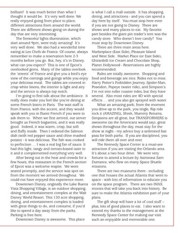 brilliant! It was much better than what I thought it would be. It’s very well done. We really enjoyed going from place to place, different attractions from around the world. There are different shows going on during the day that are very interesting. The fireworks/ lights illumination, which start around 9pm, were truly amazing! It’s very well done. We also had a wonderful time eating at Les Chefs de France. Of course, always remember to make a reservation here 2-3 months before you go. But, hey, it’s in Disney, what can you expect? This is one of Epcot’s overlooked gems. Many of the tables overlook the ‘streets’ of France and give you a bird’s eye view of the comings and goings while you enjoy your delicious meal. The tables are covered in crisp white linens, the interior is light and airy and the service is always top notch. I’m going to first talk about the ambiance. It really does make you feel like you’re dining at some French bistro in Paris. The wait staff is from France, with the accent, and they would speak with you in fluent French if you were to ask them to. When we first arrived, our server brought us French baguettes, and it was really good. Indeed, it was warm, crisp, but soft and fluffy inside. Then I ordered the Salmon dish (with red pepper sauce and chive mashed potato) - it was delicious. The fish was cooked to perfection … I was a real big fan of sauce. It had this light, tangy and tomato-based taste to it and it complemented everything very well. After being out in the heat and crowds for a few hours, this restaurant in the French section of Epcot was a welcome respite. We were seated promptly, and the service was spot on from the moment we arrived throughout. We could not have enjoyed this experience more. Downtown Disney, originally the Lake Buena Vista Shopping Village, is an outdoor shopping, dining, and entertainment complex at the Walt Disney World Resort. This 120 acre shopping, dining, and entertainment complex is loaded with great things to do, and consume, if you’d like to spend a day away from the parks. Parking is free here. Downtown Disney is awesome. This place