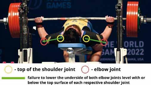 Penkkipunnerruksen hylkäämiseen johtavat syyt on lisätty (syykoodin väri on punainen): Nostaja ei laske molempien kyynärnivelten alapuolta kunkin vastaavan olkanivelen yläpinnan tasolle tai sen alapuolelle.