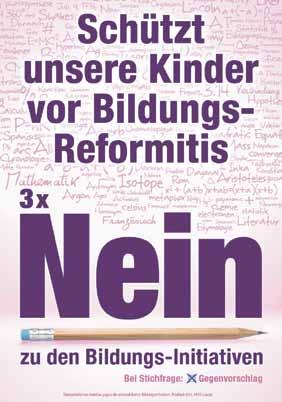 Grâce à notre démocratie directe, nous, citoyennes et citoyens, pouvons décider de la future orientation de nos écoles. Prenez activement part à notre vie politique pour empêcher que des théoriciens éloignés de la pratique scolaire de nous imposent des modèles étrangers dont le principal effet sera d’augmenter le chômage des jeunes.