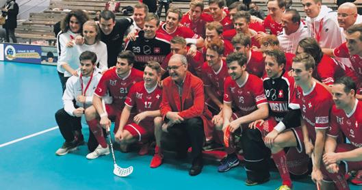 Der Sportminister mit der Schweizer Unihockey-Nati nach deren erstmaligem Sieg gegen Schweden in Kirchberg.