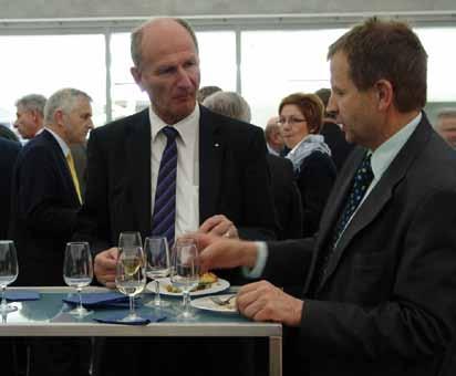 Les conseillers nationaux Hansruedi Wandfluh (à gauche) et Erich von Sibenthal lors de l’apéro dans le hangar