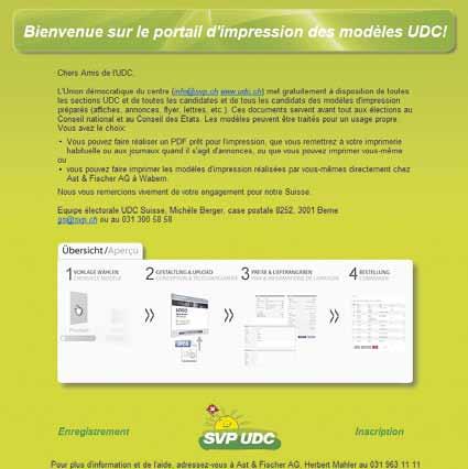 L’Union démocratique du centre met gratuitement à disposition de toutes les sections UDC et de tous les candidats et candidates des modèles d’impression tout prêts, en particulier dans la perspective des élections au Conseil national et au Conseil des États. Sur ce portail, vous pourrez concevoir les imprimés nécessaires, telles les affiches, annonces, lettres, cartes, etc. conformément à l’identité visuelle. Vous pouvez vous inscrire et accéder directement au