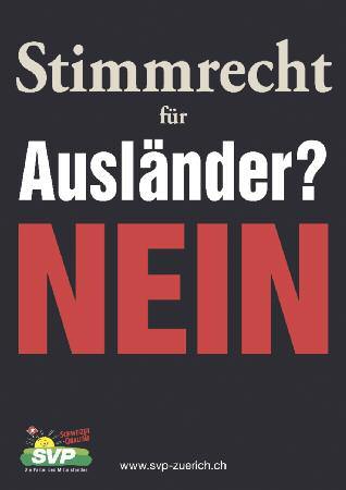 Die SVP lehnt die kantonale Volksinitiative für das Stimm- und Wahlrecht für Ausländer ab Bei der Annahme der Initiative würde weder die ausländische Wohnbevölkerung besser integriert noch deren Kenntnisse unserer Landessprache verbessert Stattdessen würde der Integrationswille der Ausländer wohl eher sinken, wenn das Stimmund Wahlrecht nach einer bestimmten Aufenthaltszeit automatisch gewährt wird Das Schweizer Bürgerrecht steht allen Ausländern offen, die sich genügend um Integration bemühen
