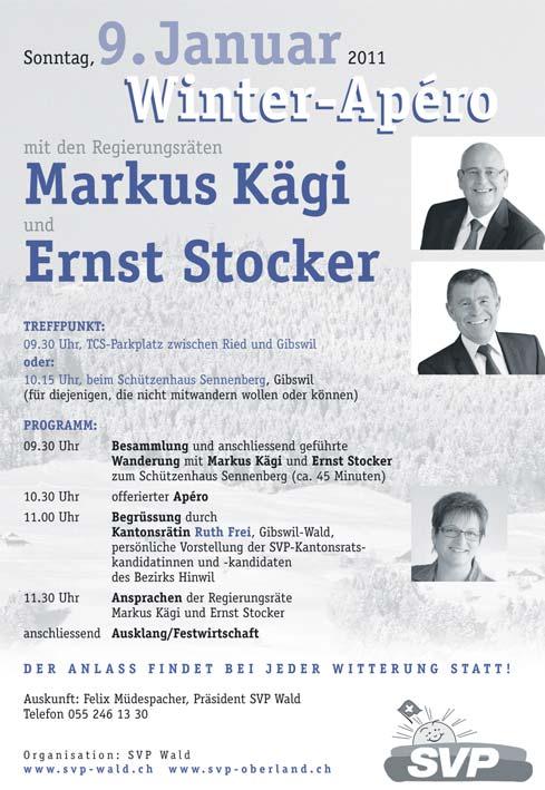 Sonntag, 9. Januar 2011, Winter-Apéro mit den bisherigen Regierungsräten Markus Kägi und Ernst Stocker. Treffpunkt: 09.30 Uhr TCS Parkplatz zwischen Ried und Gibswil oder 10.15 Uhr beim Schützenhaus Sennenberg, Gibswil (für diejenigen, die nicht mitwandern wollen oder können). Programm: 09.30 Uhr: Besammlung und anschliessend geführte Wanderung mit Markus Kägi und Ernst Stocker zum Schützenhaus Sennenberg (ca. 45 Minuten). 10.30 Uhr: offerierter Apéro. 11.00 Uhr: Begrüssung durch Kantonsrätin Ruth Frei, Gibswil-Wald. Persönliche Vorstellung der SVP-Kantonsratskandidatinnen und -kandidaten des Bezirks Hinwil. 11.30 Uhr: Ansprachen der Regierungsräte Markus Kägi und Ernst Stocker. Anschliessend Ausklang / Festwirtschaft. Der Anlass findet bei jeder Witterung statt! Auskunft: Felix Müdespacher, Präsident SVP Wald, Telefon 055 246 13 30.