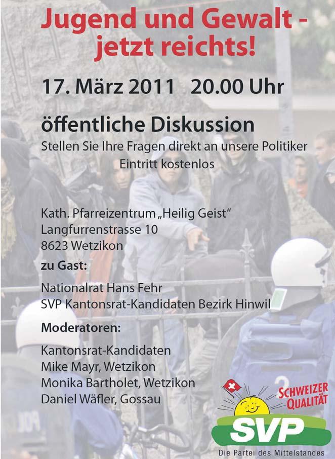 Bezirk Hinwil / Wetzikon Donnerstag, 17. März 2011, 20.00 Uhr, kath. Pfarreisaal, Wetzikon, öffentliche Podiumsveranstaltung zum Thema «Jugend und Gewalt», mit den Kantonsratskandidaten der SVP Bezirk Hinwil sowie mit Nationalrat Hans Fehr.