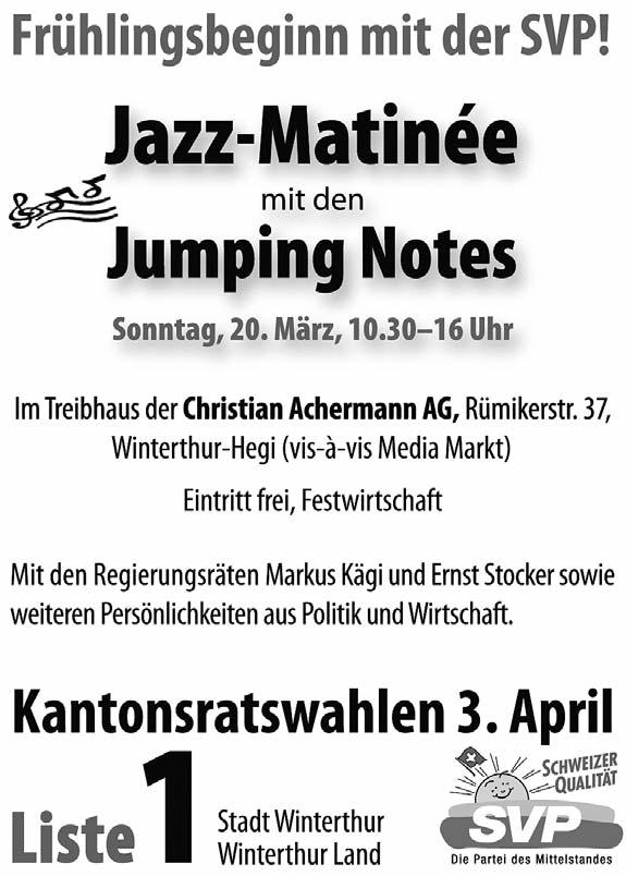 Bezirk Winterthur und Winterthur Stadt Sonntag, 20. März 2011, 10.30–16.00 Uhr, auf dem Betriebsareal (Treibhaus) der Christian Achermann AG, Rümikerstrasse 37, Winterthur Hegi (vis-à-vis Media-Markt), JazzMatinée. Es spielen für Sie von 11.00 bis 15.00 Uhr die «JUMPING NOTES». Eintritt frei. Festwirtschaft. Anwesend ist die Prominenz aus Politik und Wirtschaft.