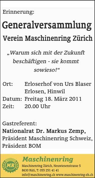 Freitag, 25. März 2011, 20.00 Uhr, Sport- und Kulturzentrum Gries, Usterstrasse 35, Volketswil, Generalversammlung der Jungen SVP Oberland/See mit Referat von Nationalrat Hans Fehr zum aktuellen Thema «Warum wählen (auch junge) Schweizer SVP?».