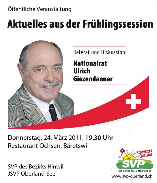 Montag, 21. März 2011, 20.00 Uhr, Hotel Sonne, Reiden/LU, Wahlveranstaltung der SVP-Kreispartei Willisau. Präsentation der Kantonsratskandidaten und des Regierungsratskandidaten. Anschliessend Referat von Nationalrat Hans Fehr.