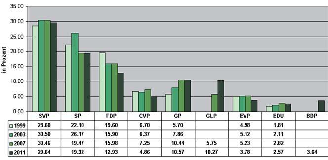 Stabil auf hohem Niveau Mit knapp 30 Prozent Wählerstimmenanteil bestätigt die SVP zum vierten aufeinanderfolgenden Mal ihre über zehnjährige Stabilität auf hohem Niveau. Alleine dem neuen Wahlsystem (Doppelter Pukelsheim seit 2007) ist es zuzuschreiben, dass die SVP-Fraktion für die Legislatur 2011–2015 nur noch mit 54 Sitzen vertreten sein wird (–2).