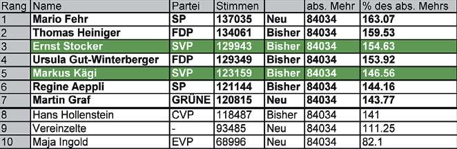 Mit der Wiederwahl von Ernst Stocker und Markus Kägi auf die guten Plätze 3 und 5 hat die SVP ihre Ziele bei den Regierungsratswahlen erreicht und sieht sich in ihrer Strategie des Alleingangs bestätigt. Baudirektor Markus Kägi ist ein unermüdlicher Schaffer für einen attraktiven, nachhaltigen und fortschrittlichen Lebensraum Zürich. Unter der Führung von Markus Kägi hat die Baudirektion während der letzten vier Jahre eine Vielzahl von Projekten in den Bereichen Planen, Bauen und Bewirtschaften realisiert. Mit der Wieder-