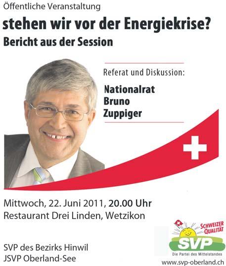 Bezirk Hinwil und Junge SVP Oberland-See Mittwoch, 22. Juni 2011, 20.00 Uhr, Restaurant Drei Linden, Wetzikon, öffentliche Veranstaltung «Stehen wir vor der Energiekrise?» –Bericht aus der Session. Referat und Diskussion: Nationalrat Bruno Zuppiger. Bezirk Uster / Volketswil und JSVP Oberland-See Freitag, 17. Juni 2011 bis Sonntag, 19. Juni 2011, beim Volg mitten in Volketswil, «Oktoberfest im Sommer», saftige Weisswürste und knusprige Brezen. Diverse weitere Köstlichkeiten und ein breites Angebot an Unterhaltung. Am Sonntag, 12.00–14.00 Uhr Besuch der Harmonie Volketswil. Das Festzelt öffnet am Freitag um 18.00 Uhr, am Samstag und Sonntag jeweils um 12.00 Uhr.
