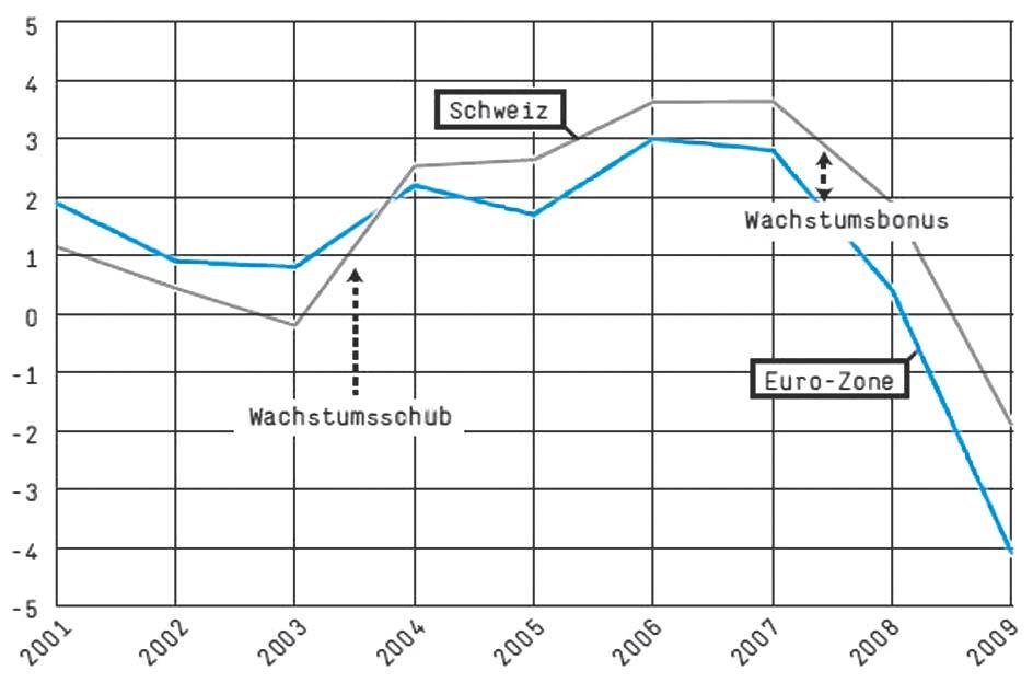 Die wirtschaftliche Entwicklung zu bremsen oder gar zu stoppen, ist aber keine Lösung. Was sie der Schweiz bringt, zeigt die Grafik: Seit 2004, also seit der Öffnung des Arbeitsmarktes, geniesst unser Land einen «Wachstumsbonus», es entwickelte sich seither in jedem Jahr, auch während der Krise, deutlich besser als die Euro-Zone. Das Leporello, das sich von der neuen Website von Avenir Suisse herunterladen oder dort bestellen lässt, kommt deshalb zum Schluss: Die Schweiz muss ihre Attraktivität bewahren, sie also immer wieder neu erarbeiten und weiterentwickeln
