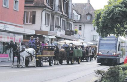 Bereits im Zentrum begegnete der Trupp der Mutschellen-Dietikon-Bahn. Das heisst, auf knappem Raum überholte das neuste Schienenfahrzeug die stramm anhaltenden Pferdegespanne –ein wahrhaft seltenes Bild!
