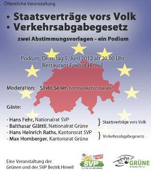 Dienstag 5 Juni 2012 20 15 Uhr Restaurant Freihof, Hinwil, Streitgespräch zwischen Nationalrat Hans Fehr und Nationalrat Balthasar Glättli, Grüne/ZH, zur Volksinitiative «Staatsverträge vors Volk» Moderation: Silvio Seiler, PR-Berater Uster Anschliessend Podium zum Verkehrsabgabengesetz mit den Kantonsräten Max Homberger und Hans-Heinrich Raths Veranstalterin: SVP Bezirk Hinwil