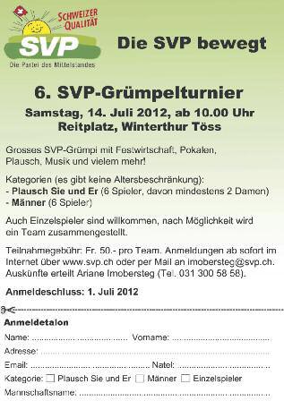 Samstag 7 Juli 2012 auf dem Bauernhof der Familie Hug (vis-à-vis Sonnweid), Bachtelstrasse 71 Wetzikon SVP-Familien-Fest mit Nationalrat Toni Brunner, Präsident SVP Schweiz Programm: 16 00 Uhr: Festwirtschaft Milchpromotion Hüpfburg und Malecke für Kids 19 00 Uhr: Auftakt mit musikalischer Unterhaltung und Festansprachen