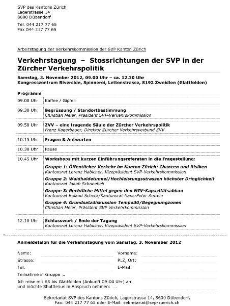 rung der Volkschule» Referenten: Dr med Hannes Geiges, Kinderarzt, CVP; Sefika Garibovic, Expertin/Dozentin für Nacherziehung, SVP; Hanspeter Amstutz, ehem Bildungsrat, EVP; NR Jürg Stahl, Sozialversicherungsrecht, SVP und Dr Christina Ruob, kant Elternorganisation, parteillos Organisiert durch SVP-Frauen Stadt und Kanton Zürich zusammen mit der Bildungskommission Kanton Zürich Die Teilnehmerzahl ist auf 50 Personen beschränkt Anmeldung bis spätestens Samstag, 10 November 2012, an Anita R Nideröst, Regensdorferstrasse 77a 8049 Zürich info@frauen-svpstadt-zuerich ch Bitte Name/Vorname Adresse Telefon/E-Mail und Wahl Thementisch angeben: Dr med Hannes Geiges ärztliche Sicht; Hanspeter Amstutz pädagogische Sicht; Jürg Stahl Sozialversicherung und Dr Christina Ruob Elternbereich