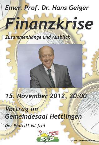 Donnerstag, 15 November 2012, 20 00 Uhr, Gemeindesaal Hettlingen öffentlicher Vortrag von Prof emer Dr Hans Geiger zum Thema «Finanzkrise: Zusammenhänge und Ausblick» Der Eintritt ist frei