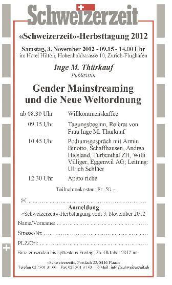 Samstag 3 November 2012 9 15 14 00 Uhr (08 30 Uhr Willkommenskaffee), Hotel Hilton, Hohenbühlstrasse 10, Zürich-Flughafen Inge M Thürkauf Publizistin Referat zum Thema «Gender Mainstreaming und die Neue Weltordnung» 9 15 Uhr: Tagungsbeginn, Referat von Frau Inge M Thürkauf; 10 45 Uhr: Podiumsgespräch mit Armin Binotto Schaffhausen Andrea Hiestand, Turbenthal ZH, Willi Villiger, Eggenwil AG; Leitung: Ulrich Schlüer 12 30 Uhr: Apéro riche Teilnahmekosten: Fr 50 –Anmeldung «Schweizerzeit»-Herbsttagung vom 3 November 2012: Name/Vorname, Strasse/Nr , PLZ/Ort Bitte anmelden bis spätestens Freitag 26 Oktober 2012 an: «Schweizerzeit» Postfach 23 8416 Flaach Telefon 052 301 31 00 – Fax 052 301 31 03 – E-Mail: info@schweizerzeit