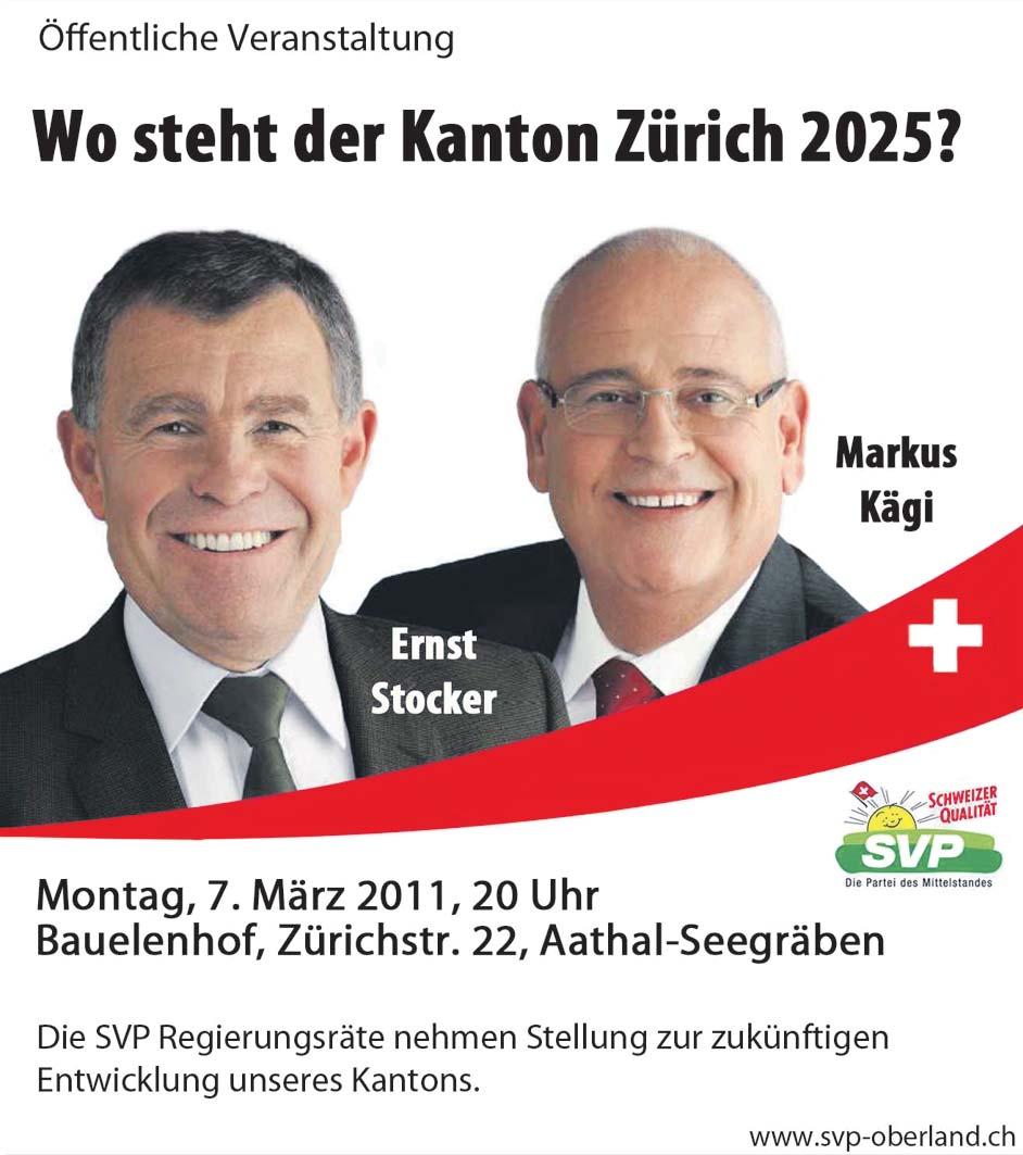 Kurzreferate Markus Kägi, Regierungsrat / Baudirektor Ernst Stocker, Regierungsrat / Volkswirtschaftsdirektor Gregor A. Rutz Kantonsratskandidat / Vizepräsident SVP Kt. Zürich