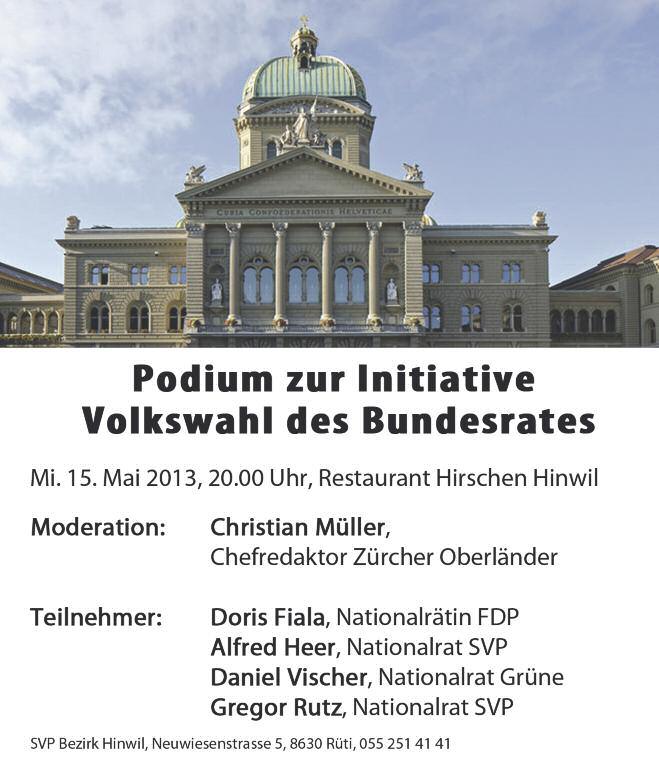 Mittwoch, 15 Mai 2013, 20 00 Uhr, Restaurant Hirschen, Hinwil, Podium zur Initiative «Volkswahl des Bundesrates» Moderation: Christian Müller, Chefredaktor «Zürcher Oberländer» Teilnehmer: Doris Fiala, Nationalrätin FDP; Alfred Heer, Nationalrat und Parteipräsident SVP; Daniel Vischer, Nationalrat Grüne, und Gregor Rutz, Nationalrat SVP