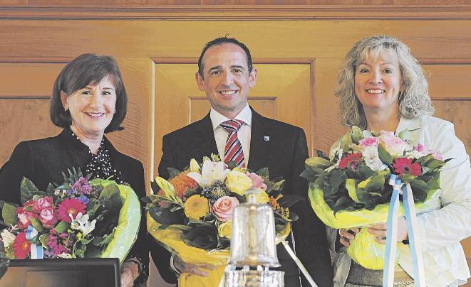Kantonsratspräsident Bruno Walliser umgeben mit seinen Vizepräsidentinnen Brigitta Johner und Theresia Weber