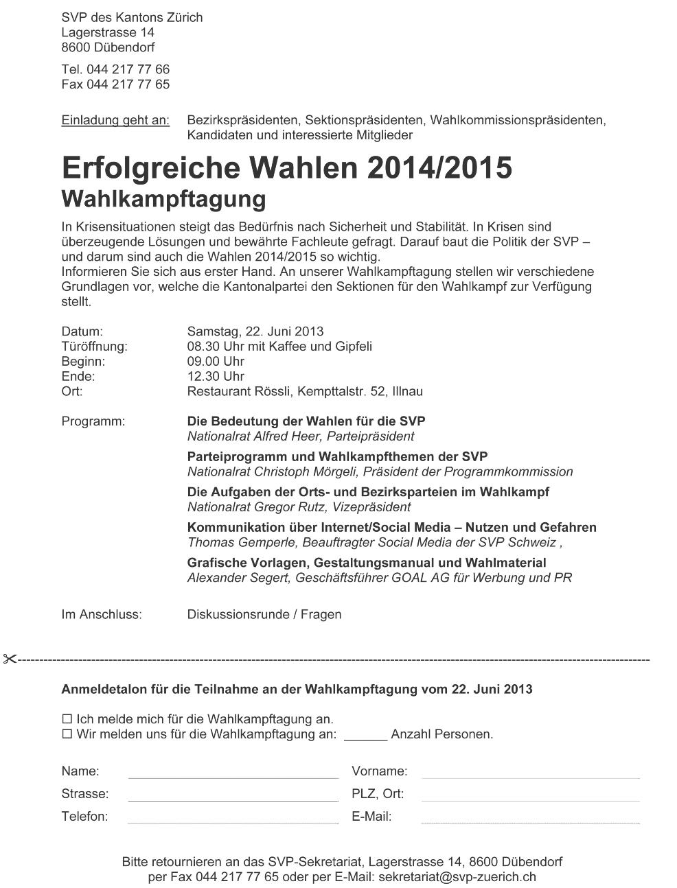 Samstag, 11 Mai 2013, 10 00–15 00 Uhr, Landgasthof Sonne «Haus der Freiheit», Wintersberg, Ebnat-Kappel (www hausderfreiheit ch), Zukunftsseminar 2/13 Parteipräsident Toni Brunner begrüsst als Referenten Prof Dr Rudolf Steiger, emeritierter Titularprofessor für Menschenführung und Kommunikation an der ETH Zürich (www rudolfsteiger ethz ch) zum Thema: «Warum reden wir so oft aneinander vorbei?» Die Zielsetzung: Bürgerorientiert, zielführend und überzeugend kommunizieren! Zielgruppe: Junge Mitglieder und Sympathisanten der SVP zwischen 16 und 36 Jahren sowie die Mitglieder der JSVP Anreise: Auto: Von Wattwil in Richtung Wildhaus fahren, die Umfahrungsstrasse Ebnat-Kappel benutzen und vor Krummenau links Richtung Wintersberg/Bendel/Hemberg abbiegen Dann gehts rund 2 km den Berg hinauf Bahn: Auf Voranmeldung Abholdienst ab Bahnhof Krummenau (Ankunftszeit: 9 45 Uhr) Die Teilnehmerzahl pro Anlass ist beschränkt Das Seminar ist für die Teilnehmer gratis Mittagessen und Getränke gehen zu Lasten der Teilneh-
